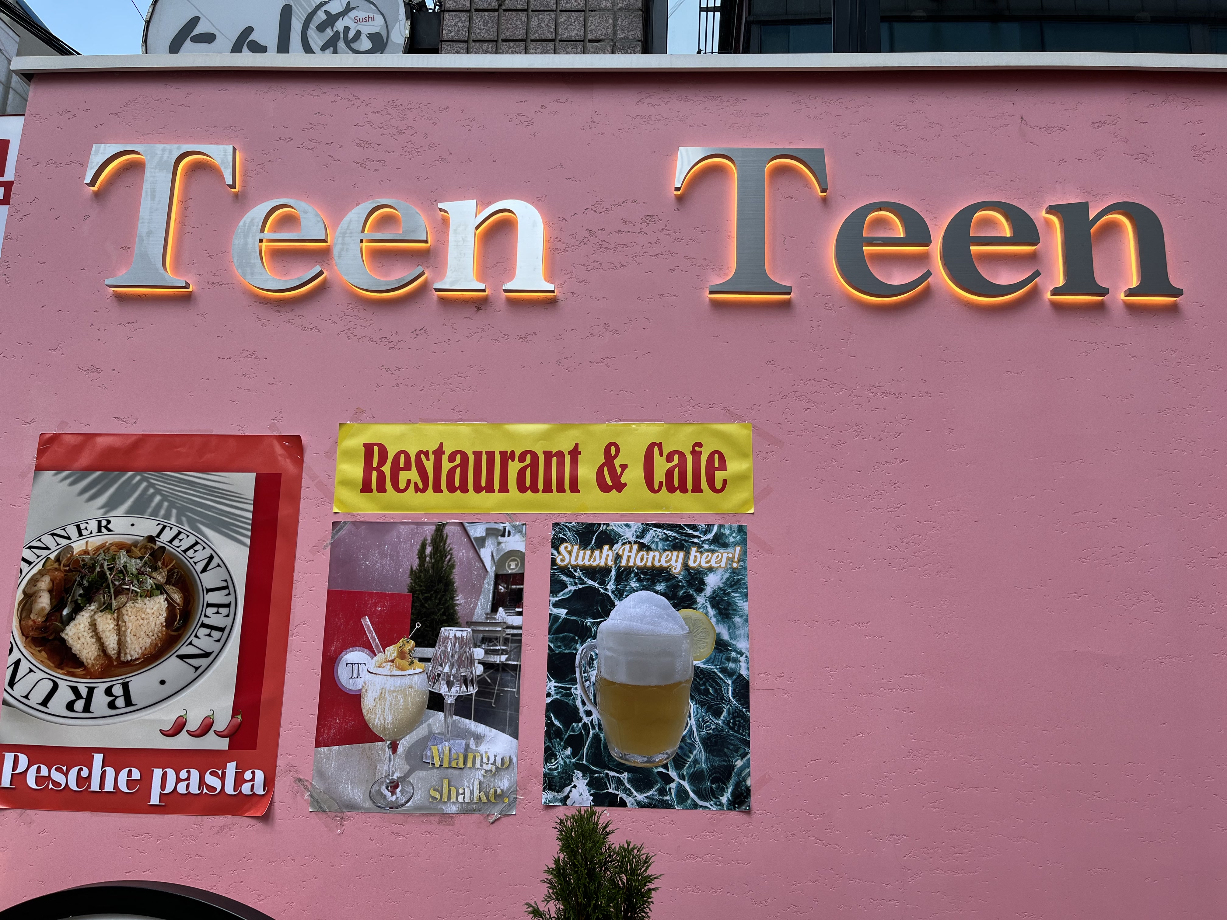 가게 이름의 Teen Teen에서 T를 모티브 해서 만든 기둥으로 보입니다. (의도했겠지? 일부러 아치형을 넣진 않았을 거 아녀)